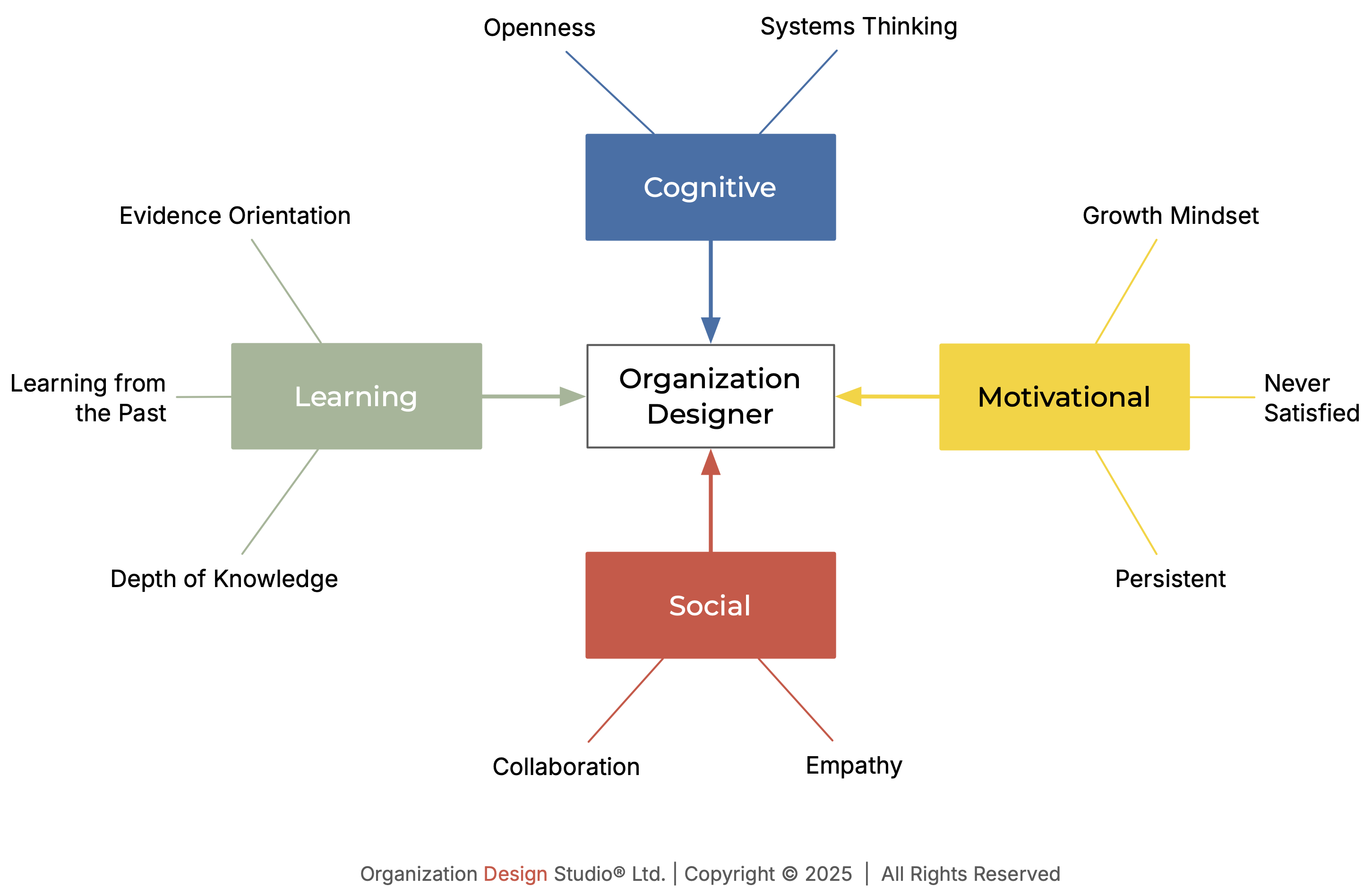 The Studio’s perspective on designers is grounded in four domains that reflect how designers think, act, interact, and learn. They provide a clear, structured way to understand what makes someone an effective organization designer.